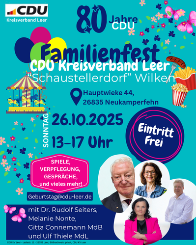 Als Gastredner erwarten die Christdemokraten u.a. den ehemaligen Bundesinnenminister und langjährigen Bundestagsabgeordneten für den Wahlkreis „Unterems“, Dr. Rudolf Seiters (Papenburg). Die Eröffnung wird gegen 14.00 Uhr durch die Kreisvorsitzende Melanie Nonte (Hesel) erfolgen. Im Anschluss daran wird Dr. Seiters einen kurzen historischen Rückblick halten. Auch unsere örtlichen Abgeordneten ParlStS‘ Gitta Connemann MdB und Ulf Thiele MdL werden im Laufe des Nachmittags kurze Redebeiträge zu aktuellen tagespolitischen Themen halten. Die Verbände und Vereinigungen der CDU sind mit Informationsständen und Mitmach-Aktionen für alle Altersgruppen präsent. Zur Gründung der CDU 1945 hat die Bundespartei unter https://www.cdu.de/cdu-80-jahre/ weitere Hintergrundinformationen zusammengestellt.