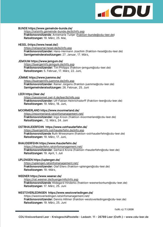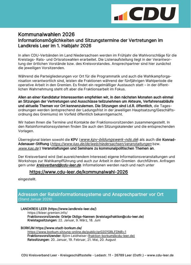 statt. Gewählt werden die Hauptverwaltungsbeamten sowie die Vertretungen in den Landkreisen und Gemeinden. An dieser Stelle werden wir von zeit zu Zeit über die Vorbereitungen der CDU im Landkreis Leer und in den Stadt- Gemeinde- und Samtgemeindeverbänden berichten.